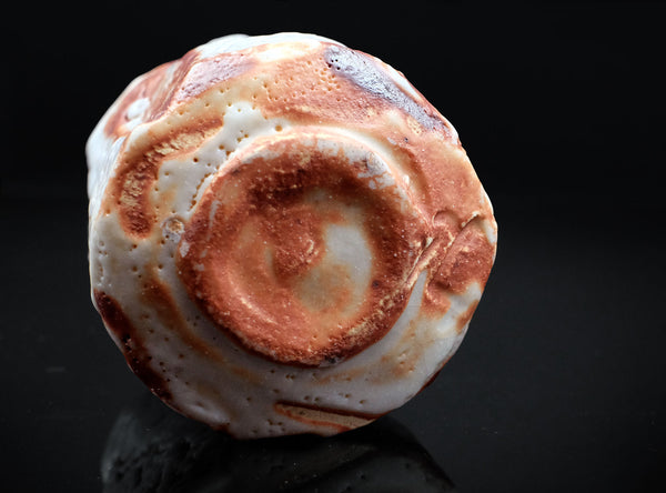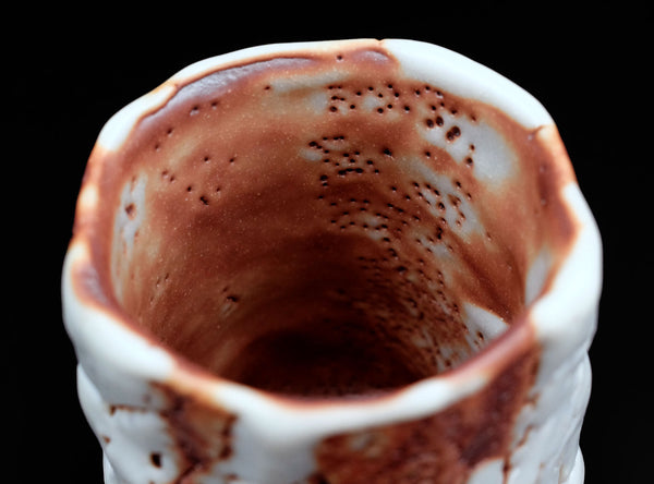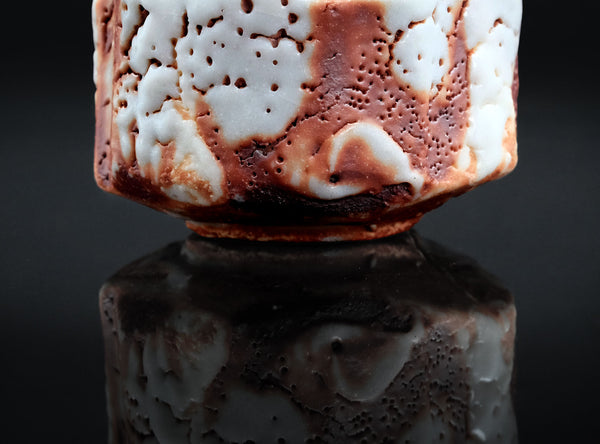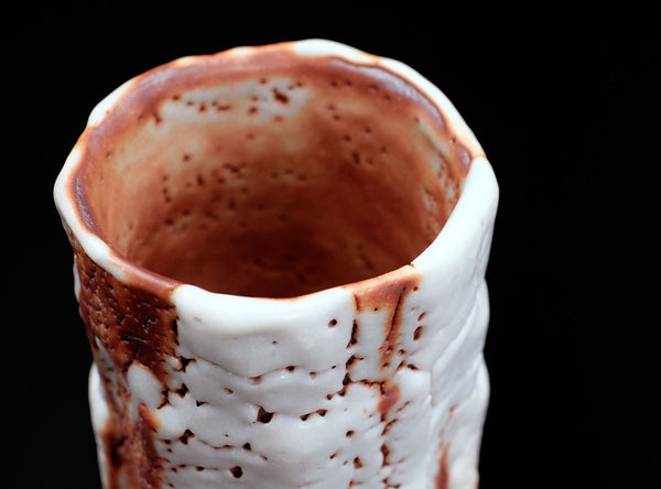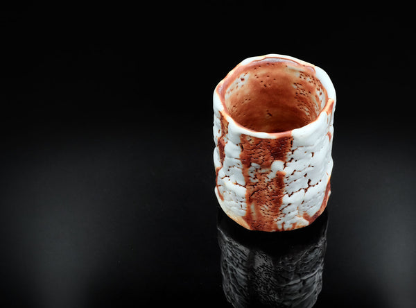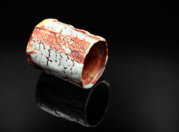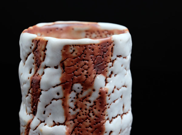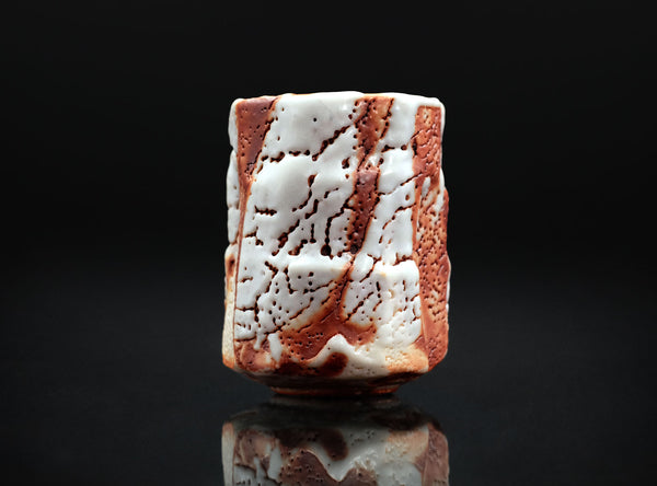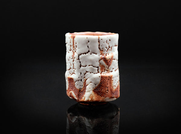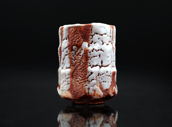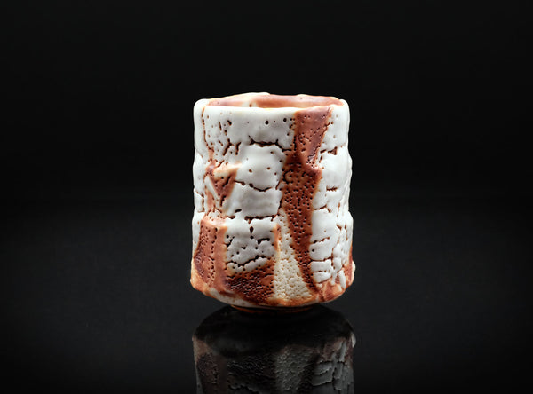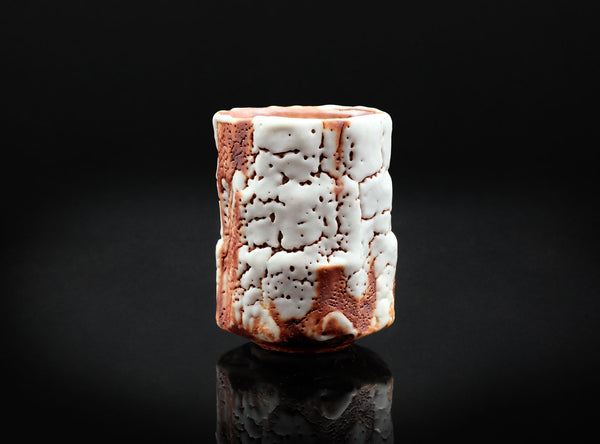 A beautiful Aka Shino yunomi (teacup) by Kato Toyohisa, a distinguished contemporary Mino-ware ceramic artist. Known for his mastery of Shino glazes, Kato's yunomi exemplifies the traditional Aka Shino style with its striking white glaze contrasting dramatically against vibrant iron-red tones. The bold and tactile surface captures the essence of wabi-sabi aesthetics, celebrating imperfections and natural forms, and ensuring each piece is truly unique.