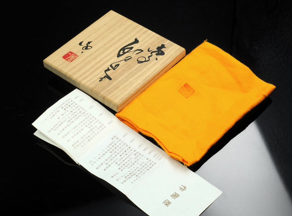 This work is presented with its original tomobako (signed wooden box), protective cloth, and documentation, marking it as both a functional sake vessel and a collectible ceramic sculpture.