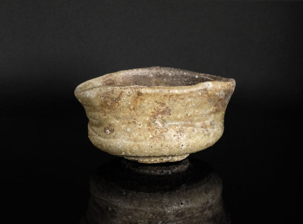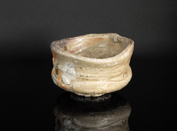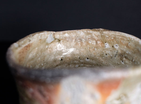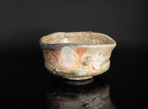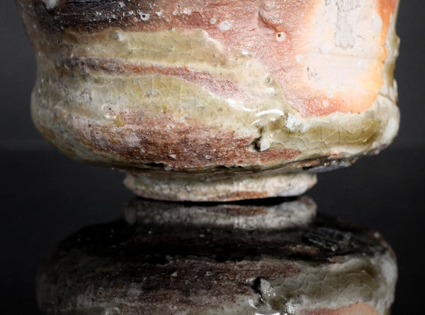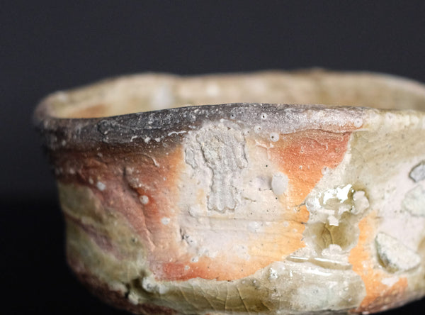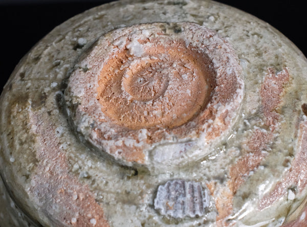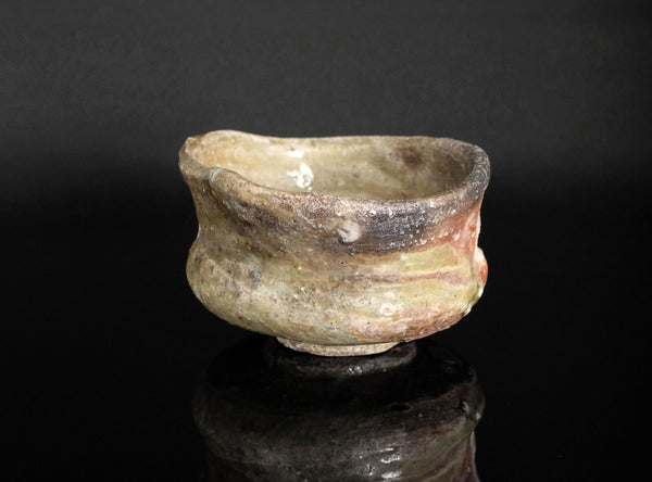 The chawan features a thick, rugged profile with natural distortions that emphasize spontaneity and earthiness. The surface bears rich textures from feldspar bursts and ash deposits, hallmarks of wood-firing, while the foot is confidently carved and the lip subtly warped—intended to be felt and seen from all angles during tea preparation. Its weight, tactility, and presence create a profound sensory experience.